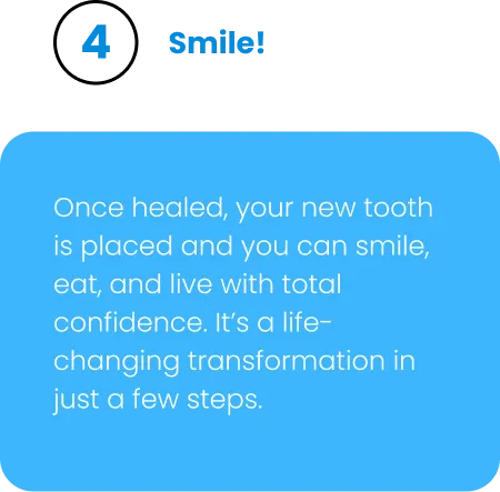 Once healed, your new tooth is placed and you can smile, eat, and live with total confidence. It’s a life-changing transformation in just a few steps.